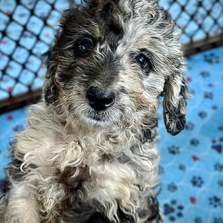 Entre los Mini Double Doodle puppies, Clover destaca como un ejemplo perfecto. Su pelaje Merle combina tonos blanco, negro y gris con un patrón único, acompañado de una mirada brillante que refleja dulzura e inteligencia.